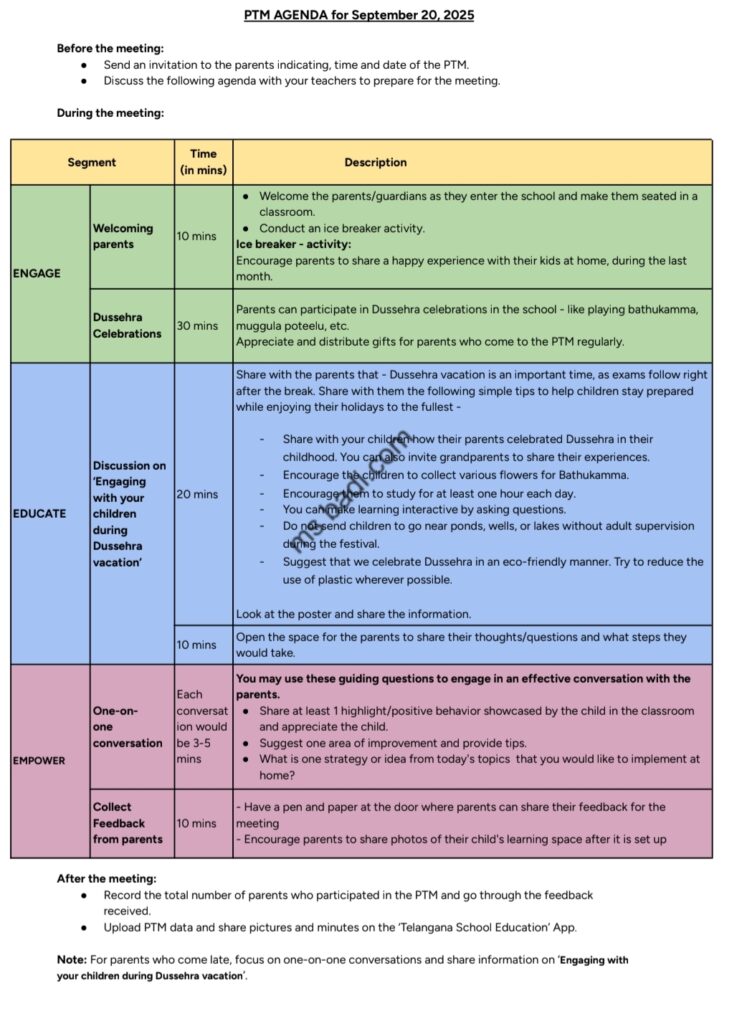 సెప్టెంబర్ నెల లో 20వ తేది రోజున అన్ని పాఠశాలల్లో పేరెంట్-టీచర్ మీటింగ్ నిర్వహించాలని SCERT ఆదేశించింది.