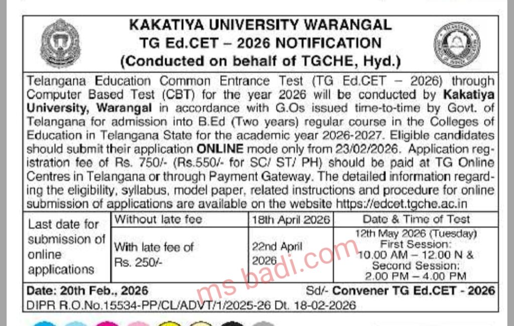 TS Ed CET-2026 ని కాకతీయ యూనివర్సిటీ – వరంగల్ నిర్వహిస్తుంది.( TSCHE- తెలంగాణ స్టేట్ కౌన్సిల్ ఆఫ్ హయ్యర్ ఎడ్యుకేషన్ తరుపున )